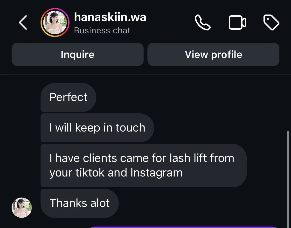 Hana Skiin wanted to broaden her audience and gain visibility by collabing with a local creator. She already has a decent size following and a posting schedule so she wasn’t in need of hiring someone for her social content or branding - she just needed an additional outlet. Playing on the “come with me to…” trend, I created a video that showcased the experience and lash lift service she offers and posted it to my Instagram and TikTik.