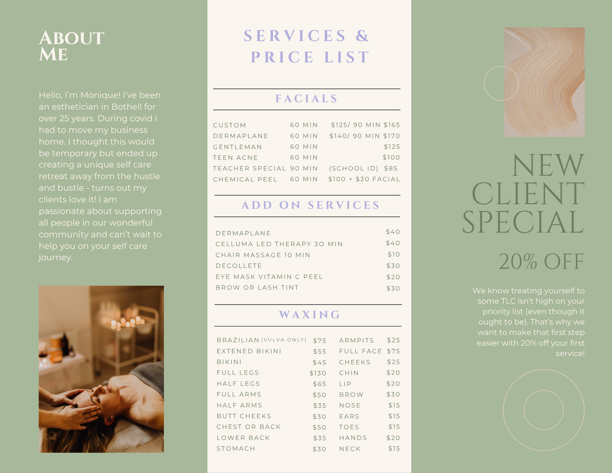 Monique has been a trusted esthetician in the Seattle area for over 25 years, building long-term relationships with clients who value her thoughtful, holistic approach to skincare. After relocating her business from a busy salon to a home-based studio during the pandemic, she experienced a sharp decline in visibility and bookings. So, she hired me!